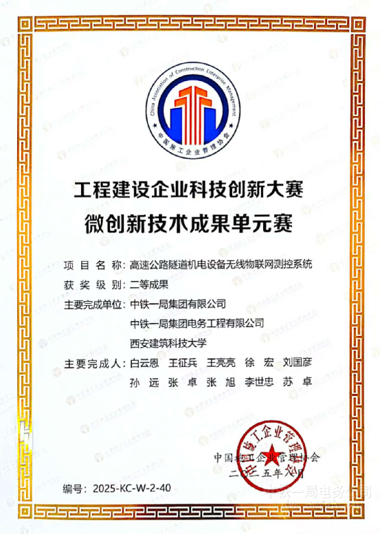 公司申報的《高速公路隧道機電設備無線物聯網測控系統》榮獲工程建設企業科技創新大賽“微創新技術成果單元賽二等成果”。該系統針對傳統隧道機電系統依賴有線傳輸、子系統孤立、運維成本高等痛點,創新引入無線物聯網技術,實現運維能力的顯著提升。系統核心包括基于Mesh的可自愈網絡控制技術,有效保障數據實時穩定傳輸;以及實時可視化管理系統,可整合多系統數據,支持遠程監控與智能調控,極大提高了運維效率。